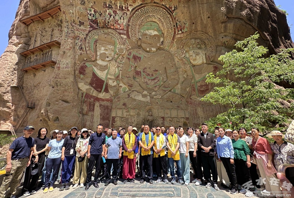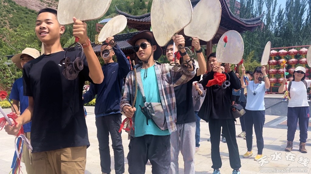 研學(xué)團(tuán)在水簾洞景區(qū)親身體驗(yàn)了國家級非物質(zhì)文化遺產(chǎn)保護(hù)項(xiàng)目武山旋鼓舞和搗蒜罐?吹绞澜绲谝荒ρ麓蠓鹄宜潞螅瑢W(xué)們無不為“十有武山祈福圣地”的奇山秀水和深厚文化所震撼,對世界第一摩崖大佛和拉梢寺雄渾瑰麗的壁畫彩塑和浮雕大為贊賞。
