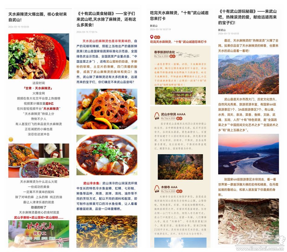 武山融媒利用新武山客戶端、抖音、快手、微博等平臺(tái),以最快的速度生產(chǎn)發(fā)布了一系列關(guān)于武山美景、美食等內(nèi)容的短視頻和圖文信息。這些內(nèi)容形式多樣、生動(dòng)有趣,迅速吸引了大量網(wǎng)友的關(guān)注和點(diǎn)贊。