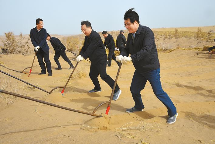 4月9日,省委書記、省人大常委會主任林鐸,省委副書記、省長唐仁健來到民勤縣龍王廟治沙造林現(xiàn)場,與干部群眾一起扶犁挖溝,壓沙植樹。本報(bào)記者 呂寶林