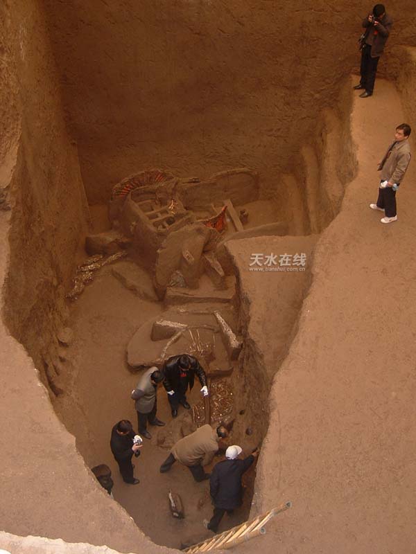 2006年7月,張家川回族自治縣公安局破獲一起盜竊古墓案,繳獲一批珍貴文物,案件上報后,引起省文物管理部門高度重視。8月13日,甘肅省文物考古研究所和張家川縣博物館聯(lián)合對被盜墓葬進行搶救性挖掘清理,出土了大量珍貴文物。同時出土的戰(zhàn)國中晚期車乘在甘肅尚屬首次發(fā)現(xiàn),在國內(nèi)也十分罕見。經(jīng)國家和省上相關(guān)專家現(xiàn)場鑒定,確定該古墓為戰(zhàn)國墓葬,其考古價值和研究價值驚人。11月15日,國家文物局副局長童明康在古墓現(xiàn)場勘察后認為:“此處墓葬遺址對研究先秦文化有十分重要的考古價值,有可能成為今年中國的十大考古發(fā)現(xiàn)之一!