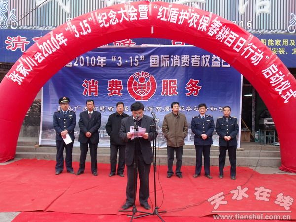 2010年3月15日,張家川縣在人民路十字舉辦了規(guī)模宏大的“3.15國際消費(fèi)者權(quán)益日”宣傳慶;顒,縣委常委、常務(wù)副縣長李肖鋒,縣人大副主任王九仲,縣政協(xié)副主席馬中華和縣委宣傳部、縣文明辦、縣工商局、縣質(zhì)監(jiān)局、農(nóng)業(yè)局等15個相關(guān)部門及部分企業(yè)、個體工商戶代表應(yīng)邀參加了紀(jì)念大會。
