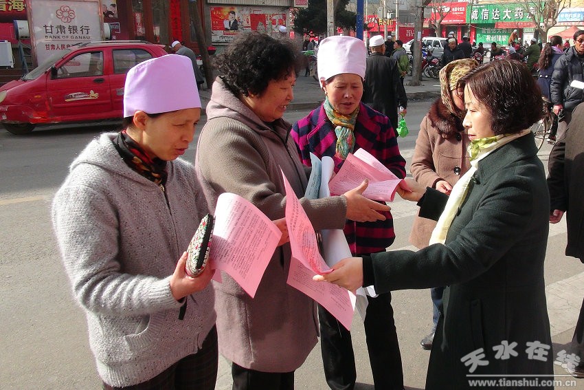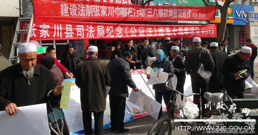 正值慶祝“三八”婦女節(jié)和《反家庭暴力法》正式實施,以及紀(jì)念《公證法》頒布實施十周年之際,為了廣泛深入開展《反家庭暴力法》和《公證法》宣傳教育,積極引導(dǎo)婦女兒童和人民群眾增強(qiáng)依法維護(hù)自身合法權(quán)益的意識和能力,進(jìn)一步推動法治張家川縣建設(shè)。3月8日上午,由張家川縣司法局牽頭,協(xié)調(diào)組織張家川縣婦聯(lián)、張家川縣公證處、甘肅乾鑫律師事務(wù)所和甘肅銀行等職能單位,積極落實“誰執(zhí)法誰普法”的原則,抽調(diào)律師、公證員、普法聯(lián)絡(luò)員和普法宣傳人員共計20余人,利用縣城逢集日,在人流較密集地——人民路十字,開展建設(shè)法制張家川巾幗在行動“三八”維權(quán)周和紀(jì)念《公證法》頒布實施十周年普法宣傳活動。與此同時,紀(jì)念《公證法》頒布實施十周年上街集中宣傳教育活動在縣域內(nèi)掀起了高潮。