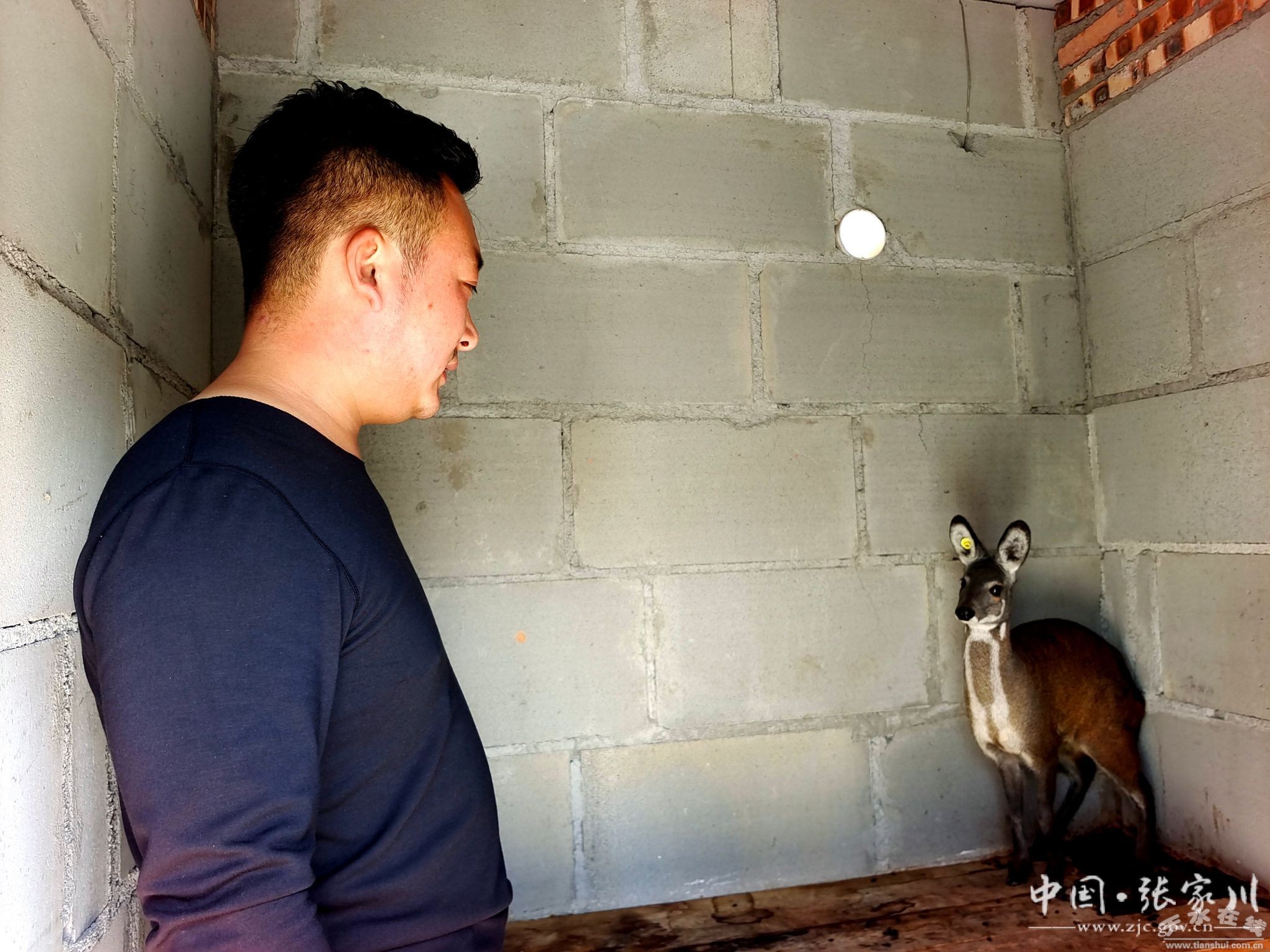 在梁山鎮(zhèn)岳山村的山坡地帶,坐落著一個特別的養(yǎng)殖場。養(yǎng)殖場內(nèi),修建了數(shù)間連棟“別墅”,每棟各含一間臥室,一間露天運動室。舍內(nèi)活潑的林麝上躥下跳,動如閃電,膽小的林麝安靜警覺,看到生人,它們從鼻孔里發(fā)出“嗤”“嗤”的警告聲。
