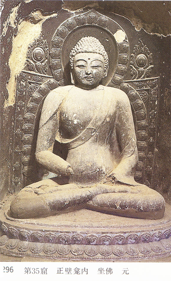 此窟較小,位于東崖第336窟左側(cè),亦為方形四角攢尖頂窟,原系北周開(kāi)窟,現(xiàn)存正壁龕內(nèi)坐佛,面形圓而短,頭頂作螺紋肉髻,坐下蓮臺(tái)及蓮花定珠背靠裝飾,種種皆屬密宗造像風(fēng)格。麥積山石窟經(jīng)北宋修繕之后,南宋建炎、紹興年間,秦州為金人所有,麥積山雖然地處宋軍所轄地界,但經(jīng)常疲于戰(zhàn)禍,加之山寺田產(chǎn)多受占奪,寺僧大部逃散外方,幾再次瀕于荒蕪,直到明代,修茸之一舉方又興起。現(xiàn)存數(shù)處后修造像,頗似元代風(fēng)格,或可說(shuō)明在麥積山石窟,元代近百年中亦并非毫無(wú)建樹(shù)。此窟內(nèi)已全部熏黑,壁畫(huà)無(wú)存,造像僅此一身。