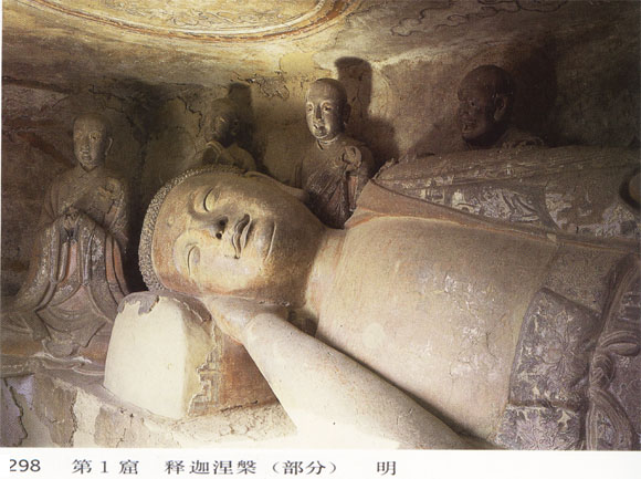 此窟位于東崖最東端,為三間四柱崖閣,早期建于元魏?邇(nèi)橫長(zhǎng)方形,平頂,正壁起通壁寬佛壇,壇上塑臥佛一身,長(zhǎng)6.30米,右脅而臥,為釋迦牟尼人般涅槃的形象,身后塑十大弟子舉哀。造像經(jīng)歷代重修,已非原貌;臥佛似仍為原胎,現(xiàn)狀略顯唐風(fēng),眾弟子則皆為明塑形象。足端坐一供養(yǎng)人,身著明代官服,是明代妝修施主的供養(yǎng)像。十大弟子,表情各異,顯示出不同的個(gè)性和修養(yǎng),盡管塑造上不免俗惡之處,仍有數(shù)身感人之作。