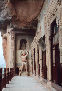 壁畫: 七個(gè)佛龕內(nèi)壁畫,全為明末清初重繪,唯諸龕外部上面的大型“薄肉塑”飛天組畫及殘存在前廊平棋上面的四幅佛傳故事畫,既為北周原作,又頗具有特色!氨∪馑堋憋w天,計(jì)五塊,約30平方米,每塊各作飛天四身,其臉部和肌體部分均為薄薄一層優(yōu)質(zhì)細(xì)泥塑出,其它如衣著、飄帶、飾物以及周圍的流云、花飾等,均彩畫而成,既生動(dòng),又極富立體感,生動(dòng)優(yōu)美,確為罕見佳作,在四幅佛傳故事畫中,尤以右側(cè)偏東的那幅騎乘人物畫最為突出。特別是那匹緩步前進(jìn)的紅馬,不論是體形動(dòng)態(tài)和神韻都繪制的維紗維肖,由于當(dāng)時(shí)的制作者,巧妙地運(yùn)用了散點(diǎn)透視和焦點(diǎn)透視的構(gòu)圖方法,又適當(dāng)考慮到人在仰視中的錯(cuò)覺關(guān)系,每當(dāng)人們從不同的位置和不同的角度來(lái)看,它都有不同的走向和動(dòng)勢(shì)。說(shuō)明我國(guó)古代畫師已掌握了透視原理及高超的技藝。