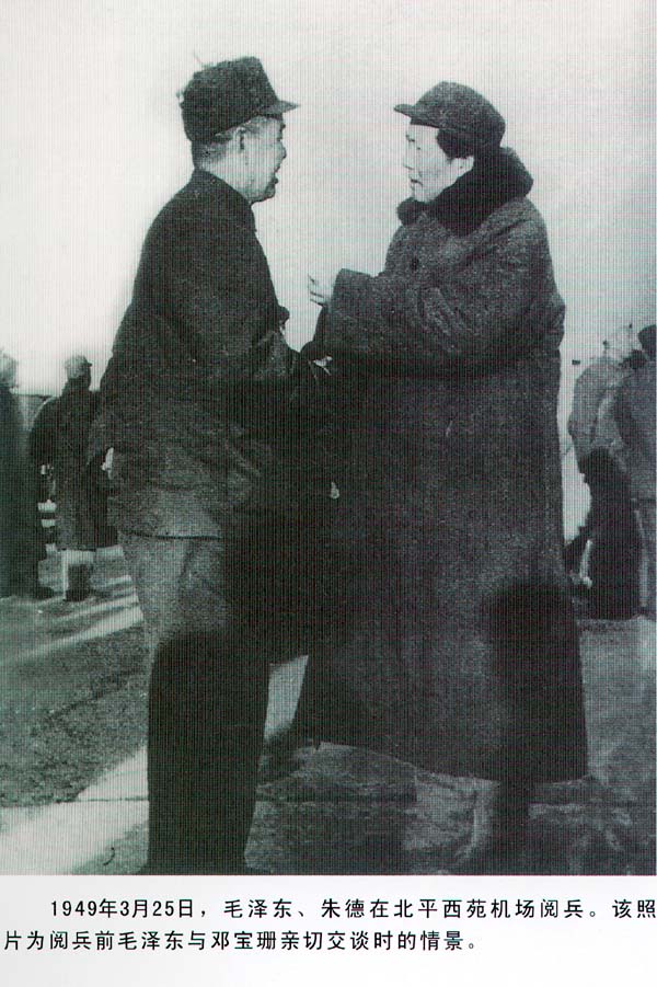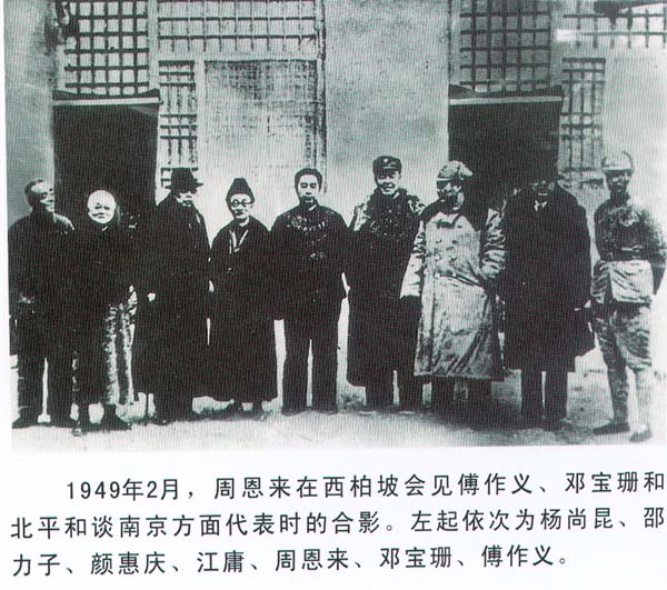 1948年8月,“華北剿總”總司令傅作義邀請副總司令鄧寶珊移駐包頭,以解其后顧之憂。鄧寶珊飛赴北平,向傅作義指陳大勢,相機進言,提出了“效忠蔣介石為下,接受改編為中,率部起義為上,”的策略。1949年1月14日,鄧寶珊作為傅作義的全權(quán)代表,出城與林彪、羅榮恒、聶榮臻進行談判。1月16日,雙方簽定《和平協(xié)定》;22日協(xié)定正式公布;31日中國人民解放軍入城,北平和平解放。由于在北平和平解放中的歷史性貢獻,時人稱鄧寶珊為“和平將軍”。1949年2月下旬,傅作義、鄧寶珊等前往河北省平山縣西柏坡,中共中央領(lǐng)導(dǎo)人毛澤東、周恩來、朱德等親切會見了他們。