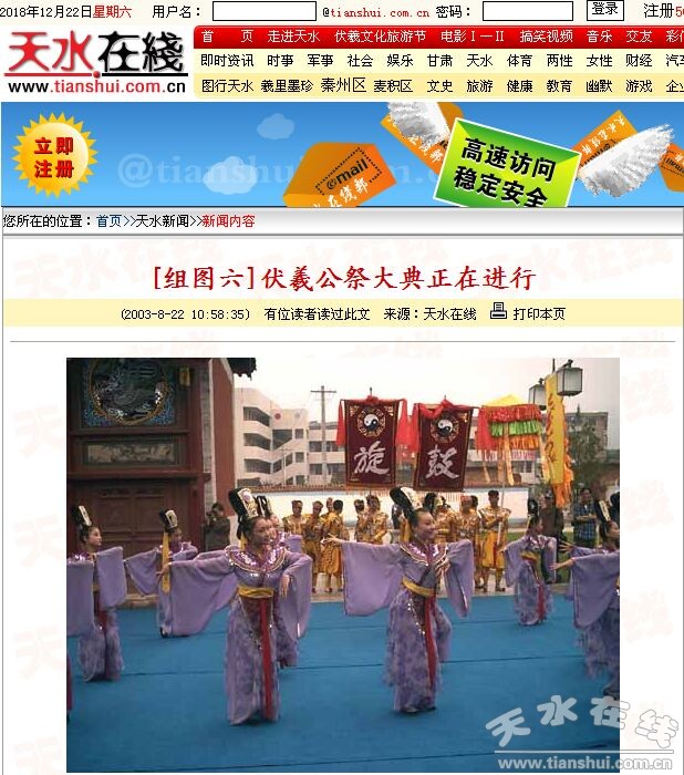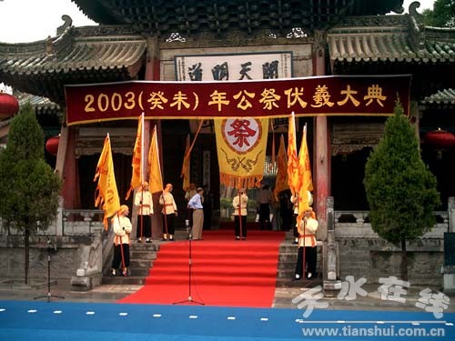 ▲2003年的節(jié)會(huì)為期4天,每天安排了一個(gè)高潮活動(dòng)。第一天是節(jié)會(huì)開幕式,第二天是公祭伏羲大典,第三天是焰火晚會(huì),第四天是明星演唱會(huì)。 這是天水在線發(fā)布的節(jié)會(huì)開幕儀式新聞。