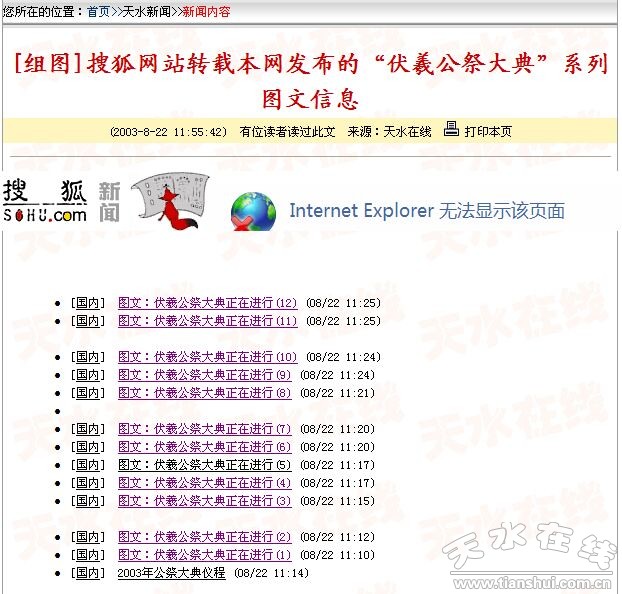 ▲2003年的節(jié)會(huì)為期4天,每天安排了一個(gè)高潮活動(dòng)。第一天是節(jié)會(huì)開幕式,第二天是公祭伏羲大典,第三天是焰火晚會(huì),第四天是明星演唱會(huì)。 這是天水在線當(dāng)時(shí)網(wǎng)絡(luò)直播伏羲大典的頁面。