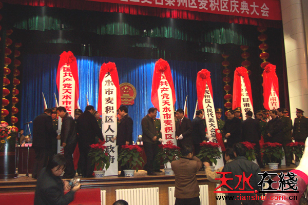 今日上午,秦州劇院內(nèi),到處洋溢著一派歡樂喜慶的氣氛、秦州、麥積兩區(qū)更名慶典大會在這里隆重舉行。上午九時,慶典大會在雄壯的國歌聲中開始,大會由市人大常委會主任李世榮主持,國家民政部區(qū)劃地名司副司長張炳善首先宣讀了國務院關于兩區(qū)更名的批復并祝賀兩區(qū)更名。副省長李膺、省政協(xié)副主席嗽敏智、省人大常委會副秘書長何光第等領導出席了大會。隨后,趙春、李世榮、王志榮、宋敬國、馮沙駝、林建波分別向秦州、麥積兩區(qū)區(qū)委、區(qū)人大常委會、區(qū)政府、區(qū)政協(xié),區(qū)紀律檢查委員會、區(qū)人武部授牌,并向兩區(qū)贈送了紀念鼎。
