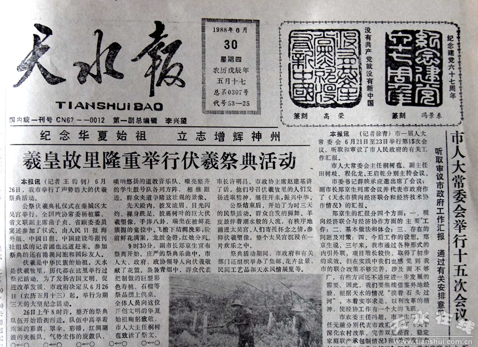 第一,記得1988年的龍年之際,天水市先后舉辦了幾個(gè)轟動(dòng)省內(nèi)外、在國(guó)內(nèi)頗有影響的大型活動(dòng),以“龍的故鄉(xiāng)”“龍的傳說(shuō)”“伏羲龍文化”為主線,形成了首次恢復(fù)公祭伏羲的歷史背景。當(dāng)時(shí)統(tǒng)稱(chēng)“四大活動(dòng)”,又都是“首次”或“首屆”,如今歷歷在目。