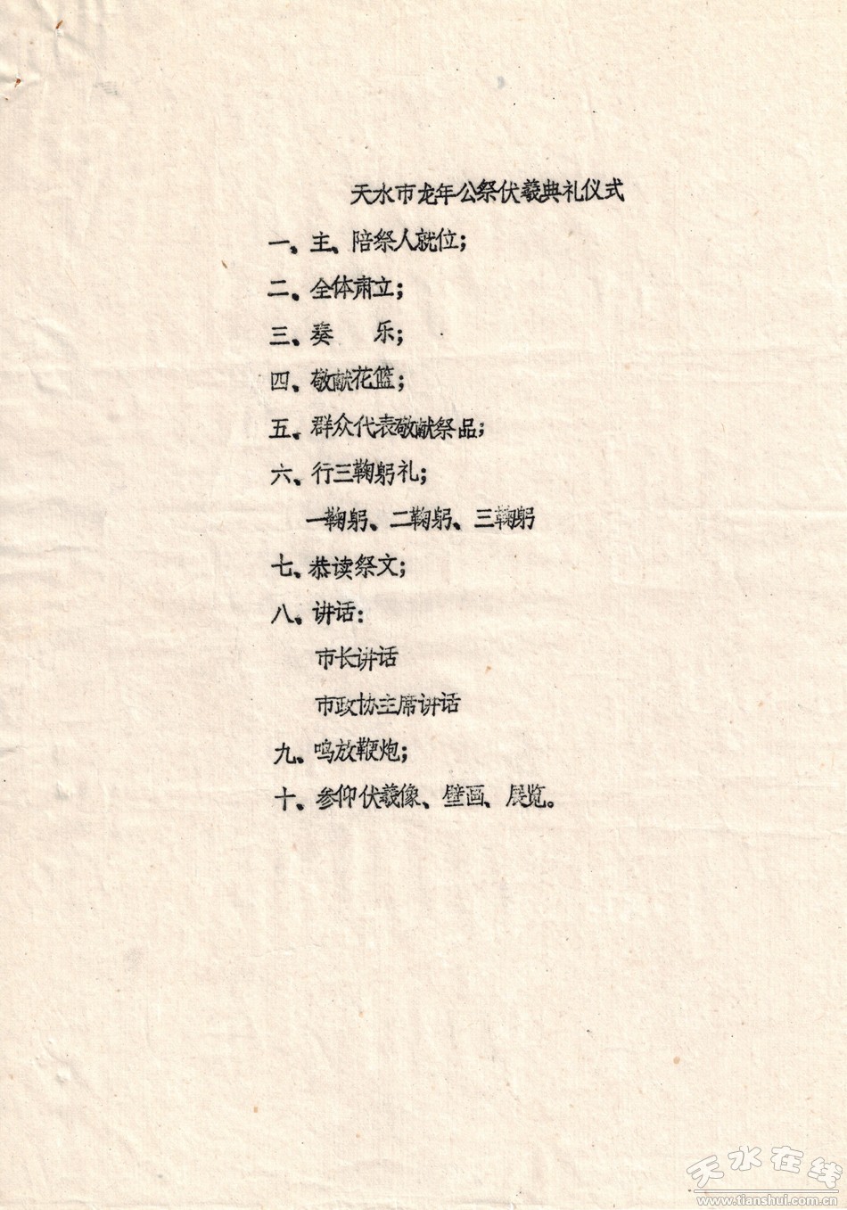 那年6月26日(龍年農(nóng)歷5月13日,龍的生日)公祭活動(dòng)在伏羲廟內(nèi)舉行,天水市民傾城而出,盛況空前。公祭儀式搞完后,民祭開(kāi)始。天水市各屆人民群眾自發(fā)地組織了民間音樂(lè)、社戲、羊皮鼓、夾板隊(duì)、旋鼓、踩高蹺等隊(duì)伍,鼓號(hào)齊鳴,載歌載舞。